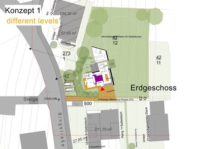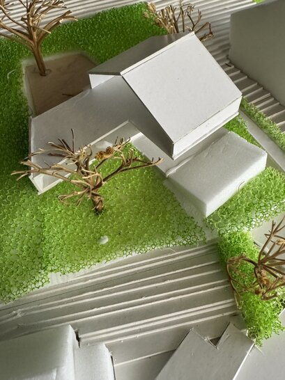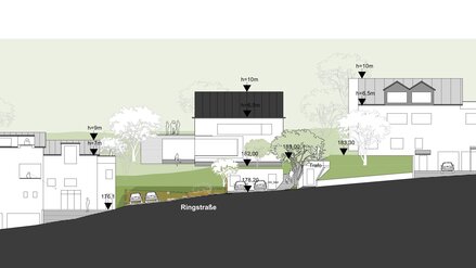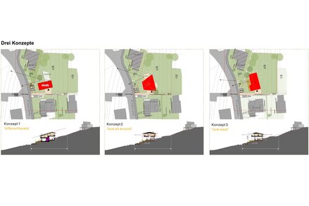 In der baukörperlichen Studie wurden drei Konzepte für das Grundstück in der Ringstraße in Malchen entwickelt. Diese befassen sich auf unterschiedliche Art und Weise mit der besonderen Lage am Hang sowie mit dem starken Grünbezug, der charakteristisch für den Standort ist. So wurden ein gerichteter West-Blick, ein Rundum-Blick in die grüne Nachbarschaft sowie eine Adaption der Hanglage in unterschiedlichen Ebenen als Lösungsansätze erarbeitet.