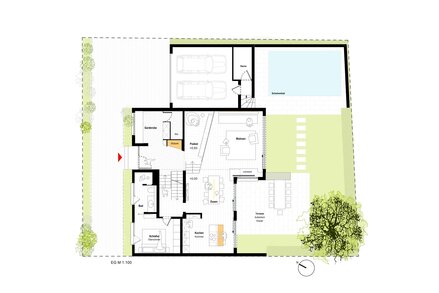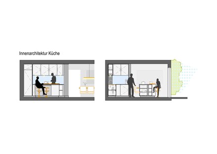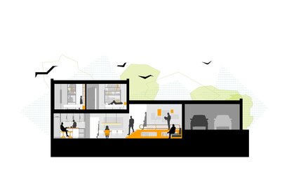 Die Sanierung des Wohnhauses in Darmstadt Eberstadt wird zum Anlass genommen, das Haus nach den Bedürfnissen der Familie neu zu gestalten. Diese Gestaltung betrifft vor allem das Schlafzimmer im Erdgeschoss mit dem angeschlossenen Badezimmer, die große Garderobe sowie die Küche als offenen Koch- und Essbereich.
